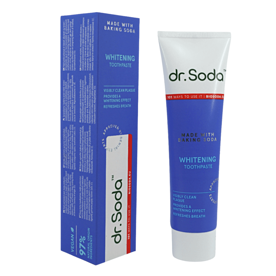 dr. Soda Whitening söögisoodaga hambapasta puhastab õrnalt, valgendab hambaid nähtavalt ja jätab kauakestva värskustunde. Naatriumvesinikkarbonaat on loodusliku tervishoiu ja isikliku hügieeni põhielement.