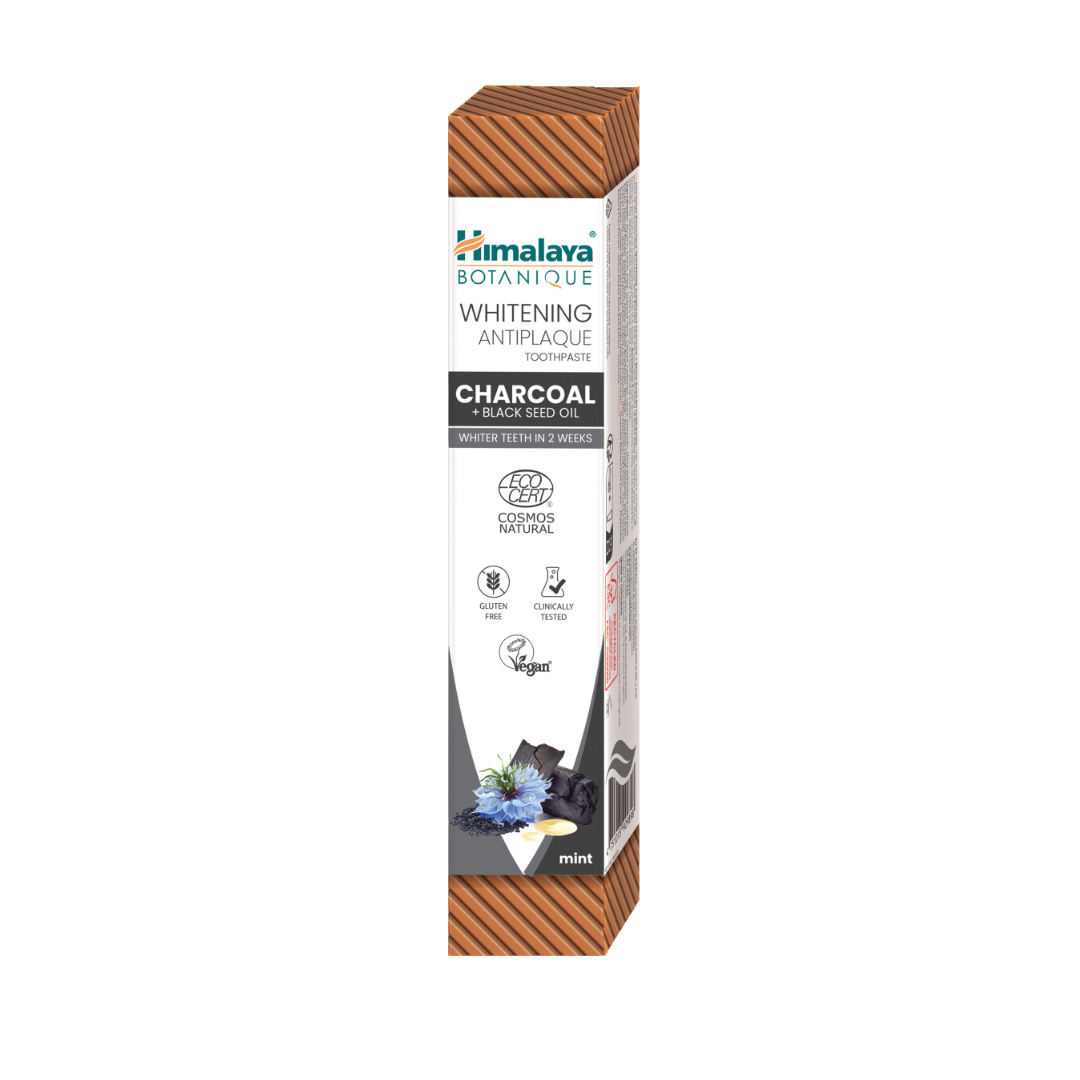 HIMALAYA Whitening Antiplaque valgendav ja hambakatu vastase toimega hambapasta aktiivsöe ja aed-mustköömne õliga. Valgendava toimega Aktiivsöega Ennetab hambakatu teket Fluoriidivaba