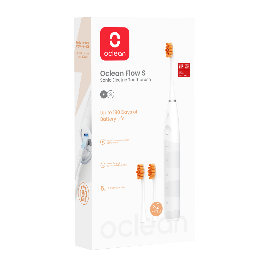 Oclean Flow S on Sonic elektriline hambahari, millel on hämmastav 180-päevane aku kasutusiga. Oclean Flow S hambaharjal on 5 režiimi, kaheminutiline nutikas taimer ja 30-sekundiline meeldetuletusfunktsioon hoolikaks ja tõhusaks harjamiseks. 1 käepide (5 režiimi) 3 otsikut Laadija (5h laadimine) Aku kuni 180 päeva