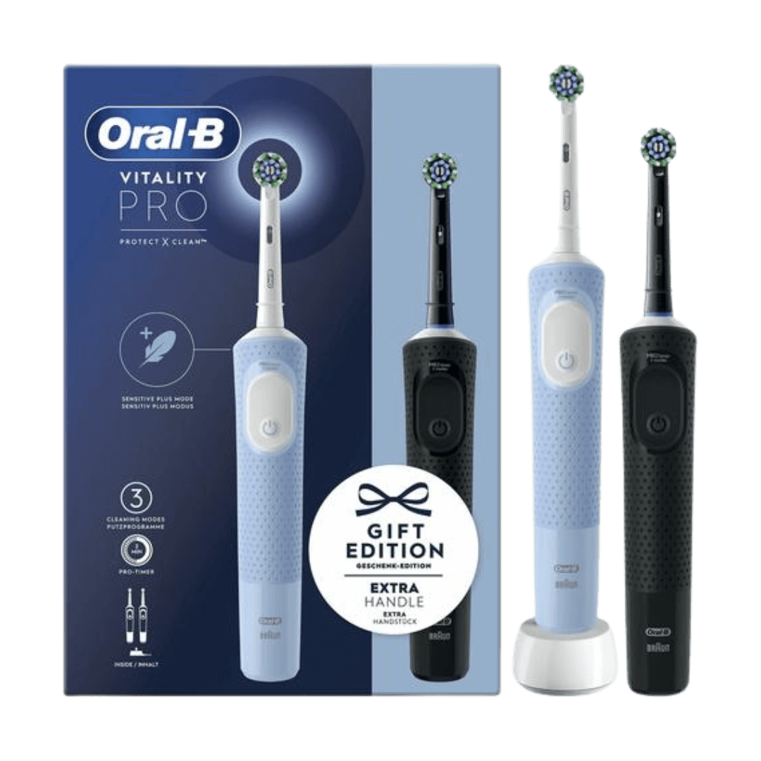 Oral-B Vitality PRO elektriline hambahari muudab Sinu hambad puhatamaks ja igemed tervemaks. Kahte hambaharja sisaldav erikomplekt. 1 käepide (Must, 3 režiimi) 1 käepide (Sinine, 3 režiimi) 2 otsikut (Keskmine tugevus) Laadija